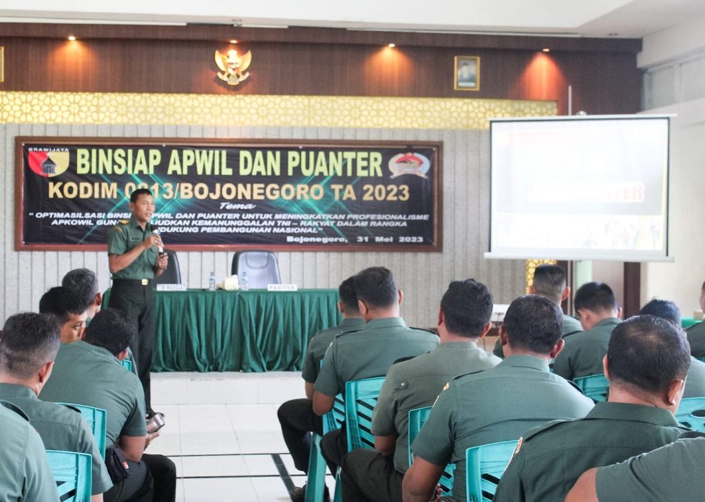 BOJONEGORO, – Dalam rangka meningkatkan kesiapan para Bintara Pembina Desa (Babinsa) dalam melaksakan tugas pemberdayaan wilayah, Kodim 0813 Bojonegoro, Jawa Timur, menyelenggarakan Pembinaan Kesiapan Aparat Kewilayahan (Binsiap Apwil) dan Kemampuan Teritorial (Puanter) di Gedung Ahmad Yani Markas Kodim setempat, Rabu (31/5/2023).