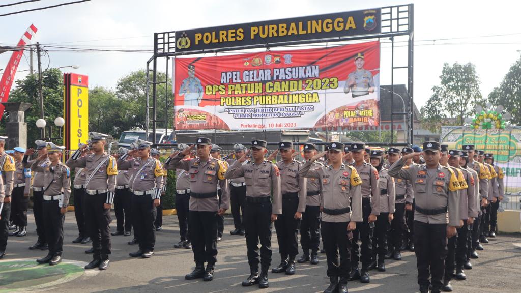 Polres Purbalingga melaksanakan Apel Gelar Pasukan Operasi Patuh Candi 2023 di halaman Mapolres Purbalingga, Senin (10/7/2023) pagi. Apel menandai berlakunya Operasi Patuh Candi 2023 di wilayah Kabupaten Purbalingga.