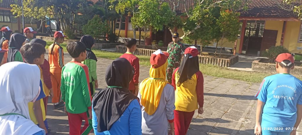 Pelda Sudiyanto bersama anggota babinsa Koramil 17 Muncar Sertu Kasiyadi dan Serda Suyarno melaksanakan pembinaan PBB diikuti oleh 200 dari siswa-siswi kelas VII SMPN 1 Muncar Kabupaten Banyuwangi pada hari Jumat 14 Juli 2023.
