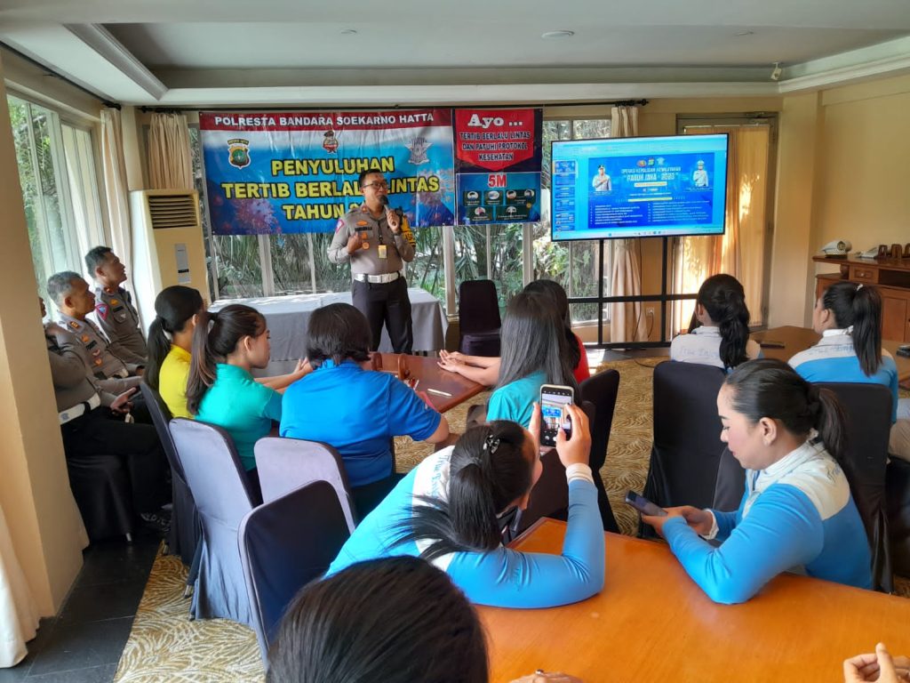 Satlantas Polresta Bandara Soekarno Hatta (Soetta) mengisi hari ke-11 Operasi Patuh Jaya 2023 dengan sosialisasi tertib berlalu lintas kepada para karyawan Golf Bandara Soekarno Hatta, Kamis 20 Juli 2023.