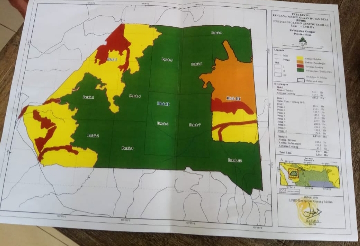Program Perhutanan sosial melalui skema Hutan Desa, izin kelola dari Kementerian Lingkungan Hidup dan Kehutanan Republik Indonesia pada tahun 2017, Nomor SK.3887/Menlhk-PSKL/PKPS/PSL.0/7/2017 tentang pemberian hak pengelolaan hutan desa kepada Lembaga Pengelola Hutan Desa (LPHD) Kenegerian Gunung Sahilan sekaligus menetapkan susunan pengurus LPHD berdasarkan Peraturan Desa yang telah dibuat dan diusulkan bersamaan usulan izin hutan desa, dengan luas 2.942. Sesungguhnya, terkait pengelolaan hutan desa di wilayah Provinsi Riau memiliki karakteristik dan keunikan tersendiri .