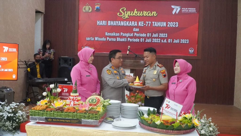 Setelah mengikuti Puncak peringatan HUT Bhayangkara ke 77 yang jatuh pada Sabtu tanggal 1 Juli 2023 di Polda Jateng, Senin 3 Juli 2023 Polres Semarang menggelar Tasyakuran, Upacara kenaikan pangkat dan Wisuda Purna Bakti Purnawirawan Polri serta ASN Polres Semarang.