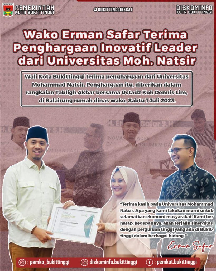 Wali Kota Bukittinggi, Erman Safar, mengapresiasi penilaian dan penghargaan dari Universitas Mohammad Natsir, terhadap program pemberdayaan masyarakat, yang dilaksanakan Pemko Bukittinggi.