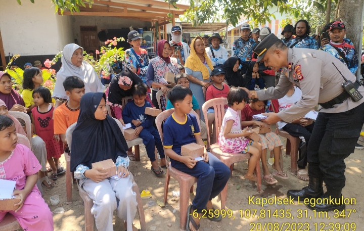 Dalam rangka dilaksanakan Kegiatan santunan ini Kapolsek Legonkulon memberi santunan kepada anak anak yatim piatu yang berjumlah 15 anak yatim piatu di wilayah desa Karangmulya kecamatan Legonkulon.