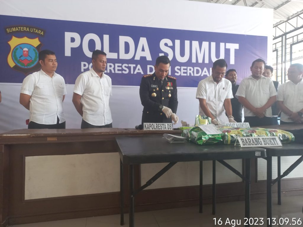 Polresta Deli Serdang berhasil amankan AG (27), seorang kurir bawa 1 (satu) tas ransel berisi 10kg narkoba non tumbuhan dalam bentuk kristal (shabu) terbungkus plastik teh merk guanyingwang berwarna hijau, dijalan Sudirman, Desa Paluh Kemiri, Kecamatan Lubuk Pakam, Senin (14-8-23).