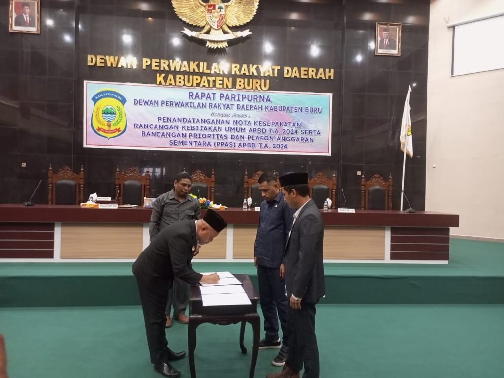 Pj. Bupati Buru, DR. Jalaludin Salampessy, S.Pi., SH., M.Si, bersama ketua DPRD Buru, M. Rum Soplestuny telah menandatangani Nota Kesepakatan Kebijakan Umum dan Prioritas Plafon Anggaran Sementara (KUA-PPAS) Anggaran Pendapatan dan Belanja Daerah Kabupaten Buru Tahun Anggaran 2024.
