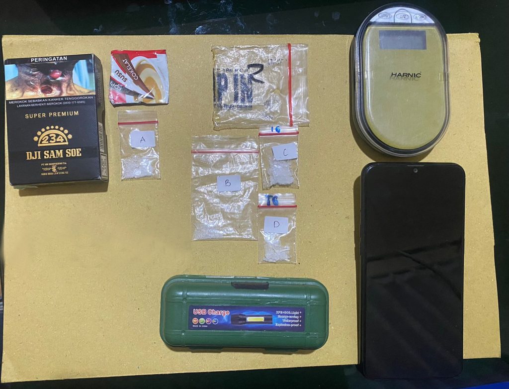 Sejumlah Barang Bukti berhasil diamankan dari tangan tersangka yakni 3 paket sabu seberat 3,36 gram yang siap diedarkan.