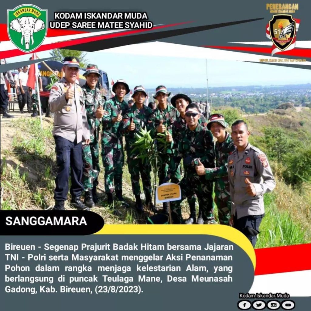 Segenap Prajurit Badak Hitam bersama Jajaran TNI – Polri serta Masyarakat menggelar Aksi Penanaman Pohon dalam rangka menjaga kelestarian Alam, yang berlangsung di puncak Teulaga Mane, Desa Meunasah Gadong, Kab. Bireuen, (23/8/2023).