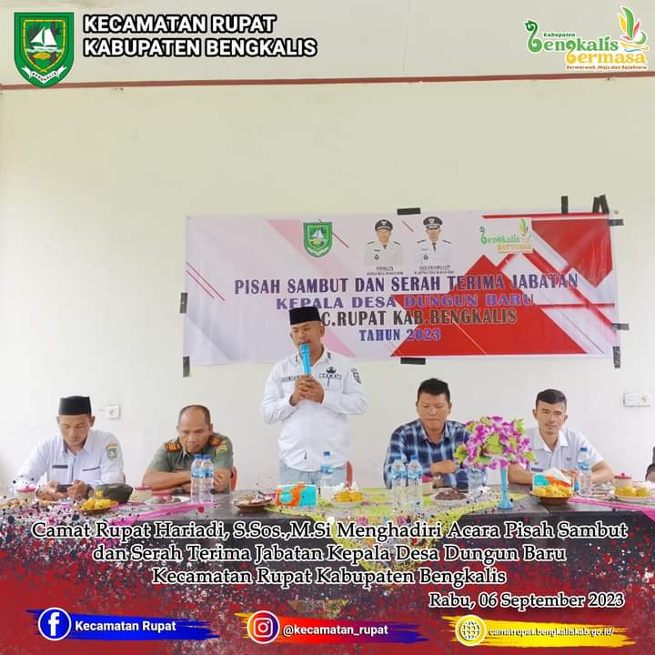Dalam hal ini Pj Kades Dungun Baru menyampaikan bahwa mulai kemarin tanggal 1 September beliau secara resmi dilantik Bupati Bengkalis dan dilanjutkan serah terima jabatan pada hari Rabu Tanggal 6 September 2023. Sesuai arahan Ibu Bupati Bengkalis dan Camat Rupat untuk Kades terlantik langsung melaksanakan tugas di desa masing-masing .