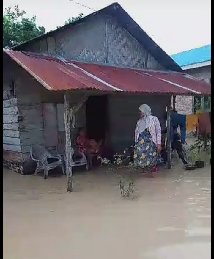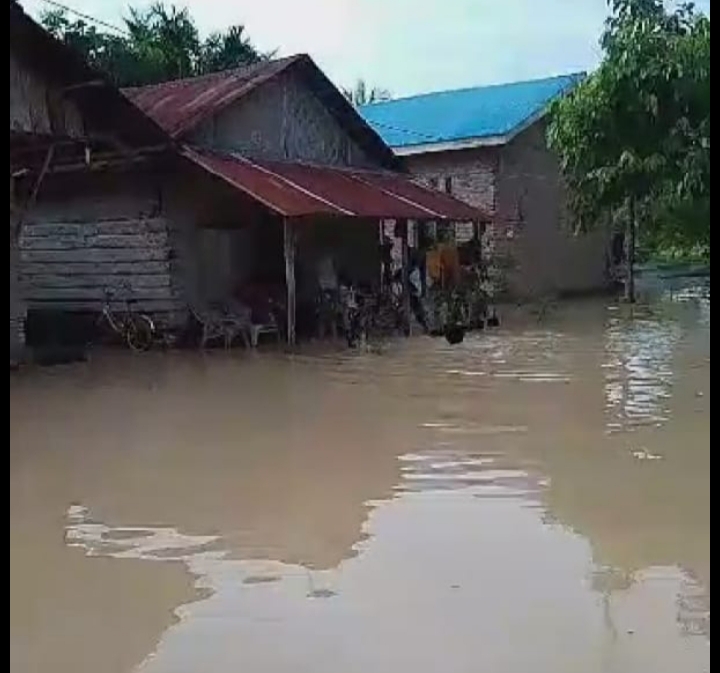 Luapan air banjir yang menggenangi rumah warga, menurut impormasi dari warga setempat di karenakan hujan deras hari Selasa sore sekira pukul 2:30 lebih kurangnya kalau tidak salah, hingga malam hujan juga belum reda, ujarnya.
