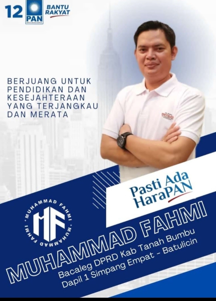 Muhammad Fahmi bacaleg DPRD Kabupaten Tanah Bumbu dari partai PAN dapil 1 Simpang empat-Batulicin sosok yang berjiwa sosial, yang akan berjuang untuk pendidikan dan kesejahteraan yang terjangkau dan merata untuk konsituennya, jangan lupa nomor 12 PAN Komitmen untuk membantu rakyat