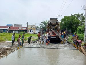 Meski cuaca ekstrem kadang hujan dan panas personel Satgas terus melanjutkan pekerjaan fisik pengecoran jalan sepanjang 335 meter x 5 meter dan pengecoran jalan/rigid beton di Jalan Pasar Nippon sepanjang 600 meter x 4 meter di Kelurahan Paya Pasir(kaperwil)