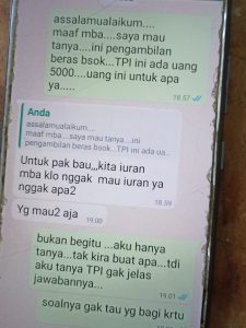 Dalam pesan WhatsApp tersebut, KPM bertanya “Mba (SR) mau tanya besok (19/9/2023) pengambilan beras CPP ada uang 5000 untuk apa ya”? Jawab Ketua PKH “Untuk pak Bau…kita iyuran mba, kalau tidak mau iyuran tidak apa apa, yang mau aja, ungkapnya di WhatsApp.