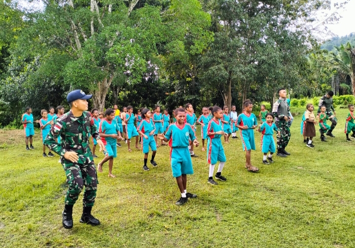Tingkatkan Kebugaran Jasmani Satgas Yonif 122/TS Ajak Senam Bersama Anak-anak SD YPPK Wembi Papua