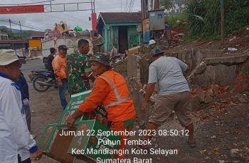 Babinsa Koramil 01/Bukittinggi Sertu Nurlis Melaksanakan kegiatan gotong royong dalam memperbaiki lingkungan di Kelurahan Puhun Tembok Kecamatan Mandiangin Koto Selayan Kota Bukittinggi. Jumat (22/09/2023).