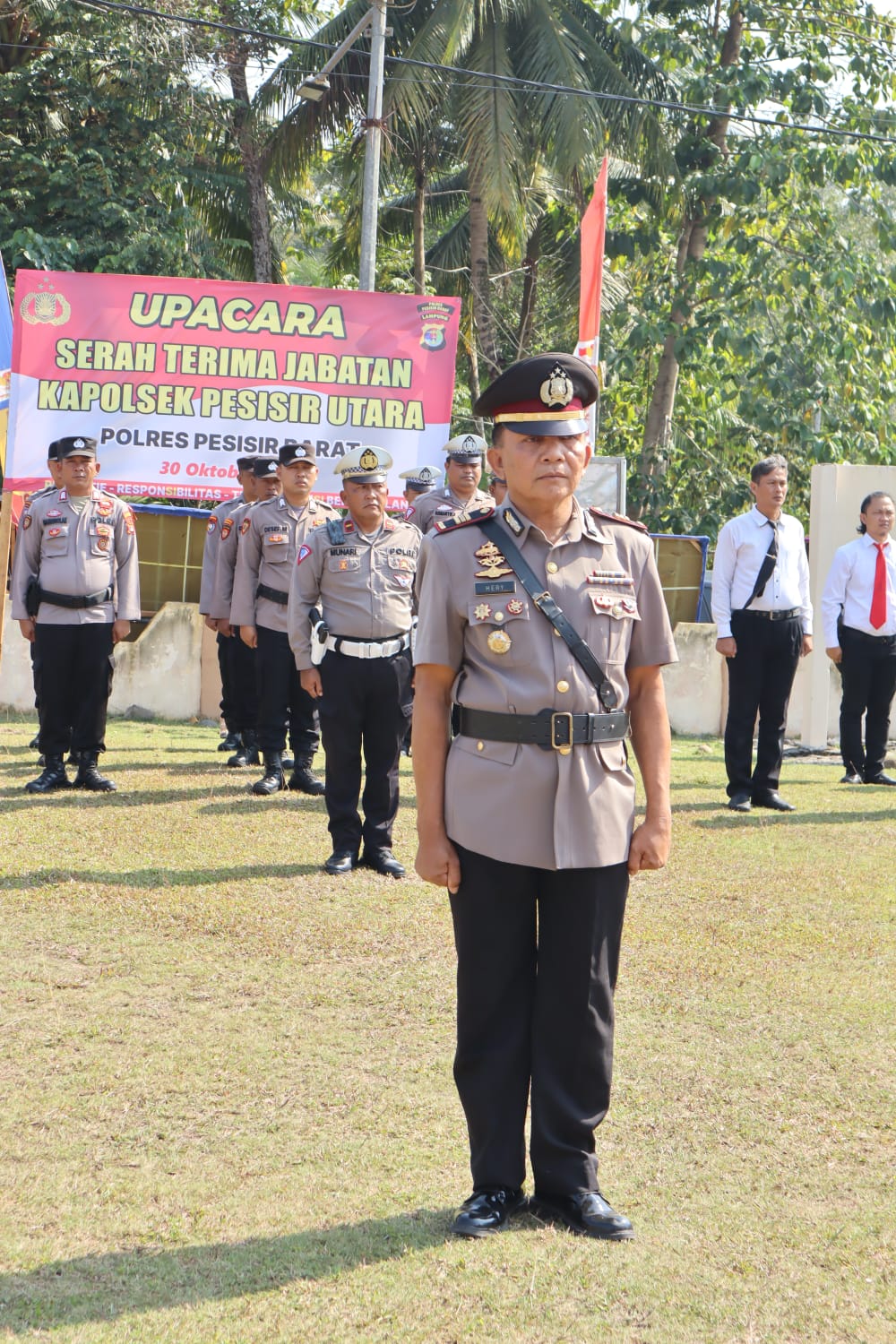Kapolres mengucapkan selamat kepada AKP (purnawirawan) Heri Oktarino, terhitung pada hari ini diberhentikan dengan hormat dari dinas polri karena batas usia pensiun, tentunya saya selaku Kapolres Pesisir Barat beserta staff dan bhayangkari mengucapkan terima kasih kepada AKP (purnawirawan) heri oktarino yang hari ini melaksanakan upacara penyerahan jabatan kapolsek pesisir utara tentunya dengan mencurahkan segenap tenaga, perhatian dan pemikiran, beliau ini telah bekerja keras dengan semangat dan penuh rasa tanggung jawab di institusi polri secara khusus di Polres Pesisir Barat.
