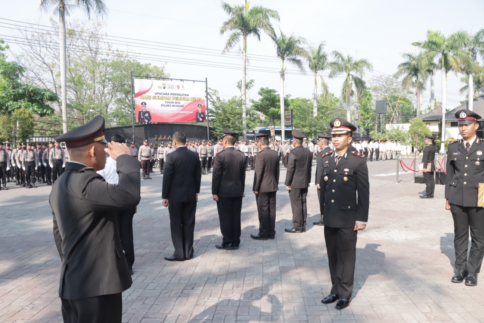 Kapolres Nganjuk AKBP Muhammad, S.H., S.I.K., M.Si., diwakili Wakapolres Nganjuk Kompol Mustijat Priyambodo, S.I.K., M.H., memimpin upacara bendera dalam rangka memperingati Hari Sumpah Pemuda ke-95 tahun 2023, Sabtu (28/10/2023).