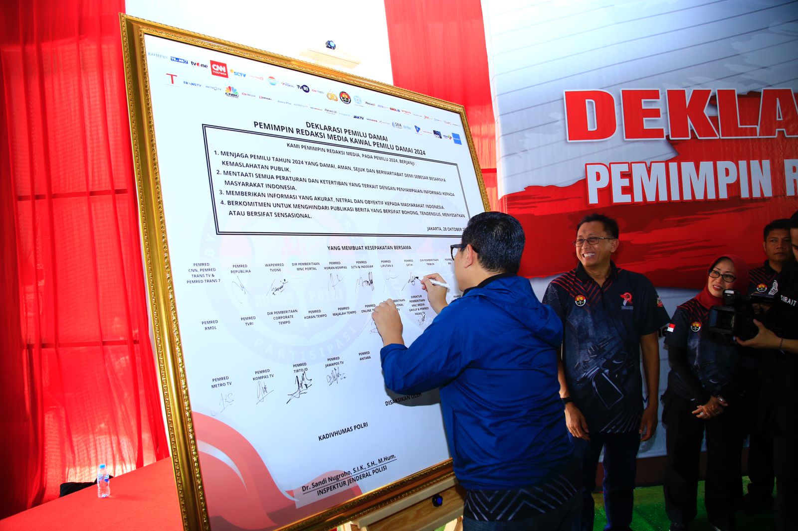 Puluhan pemimpin redaksi media massa, Divisi Humas Polri, dan Dewan Pers menggelar deklarasi pemilu damai. Deklarasi Kawal Pemilu Damai 2024 ini menjadi komitmen bersama sebagai bentuk sinergitas menghadapi pesta demokrasi.