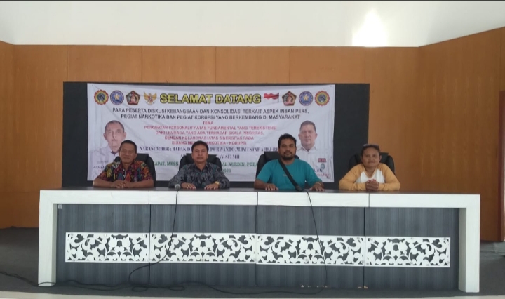 Selamat datang para peserta diskusi kebangsaan dan konsolidasi Aspek insan pers, pegiat narkotika dan pegiat korupsi, yang berkembang di masyarakat dengan Tema: penguatan personality atas pundamental dari lembaga yang ada terhadap skala prioritas dengan berkolaborasi dan sinergitas pada bidang media, narkotika, korupsi dengan Nara sumber Bapak DRS.joko Purwanto M.pd.(staf ahli RI )