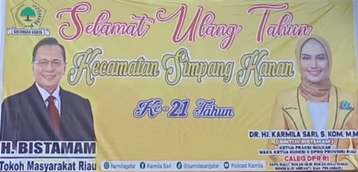 H. Bistamam, yang juga merupakan Pembina Partai Golkar Provinsi Riau, membuat baliho ucapan ulang tahun Simpang Kanan bersama politisi muda DR. Hj Karmila Sari SKOM, MM. Hj Karmila Sari adalah Ketua Fraksi Partai Golkar DPRD Riau dan saat ini menjabat sebagai Wakil Ketua Komisi V DPRD Riau.