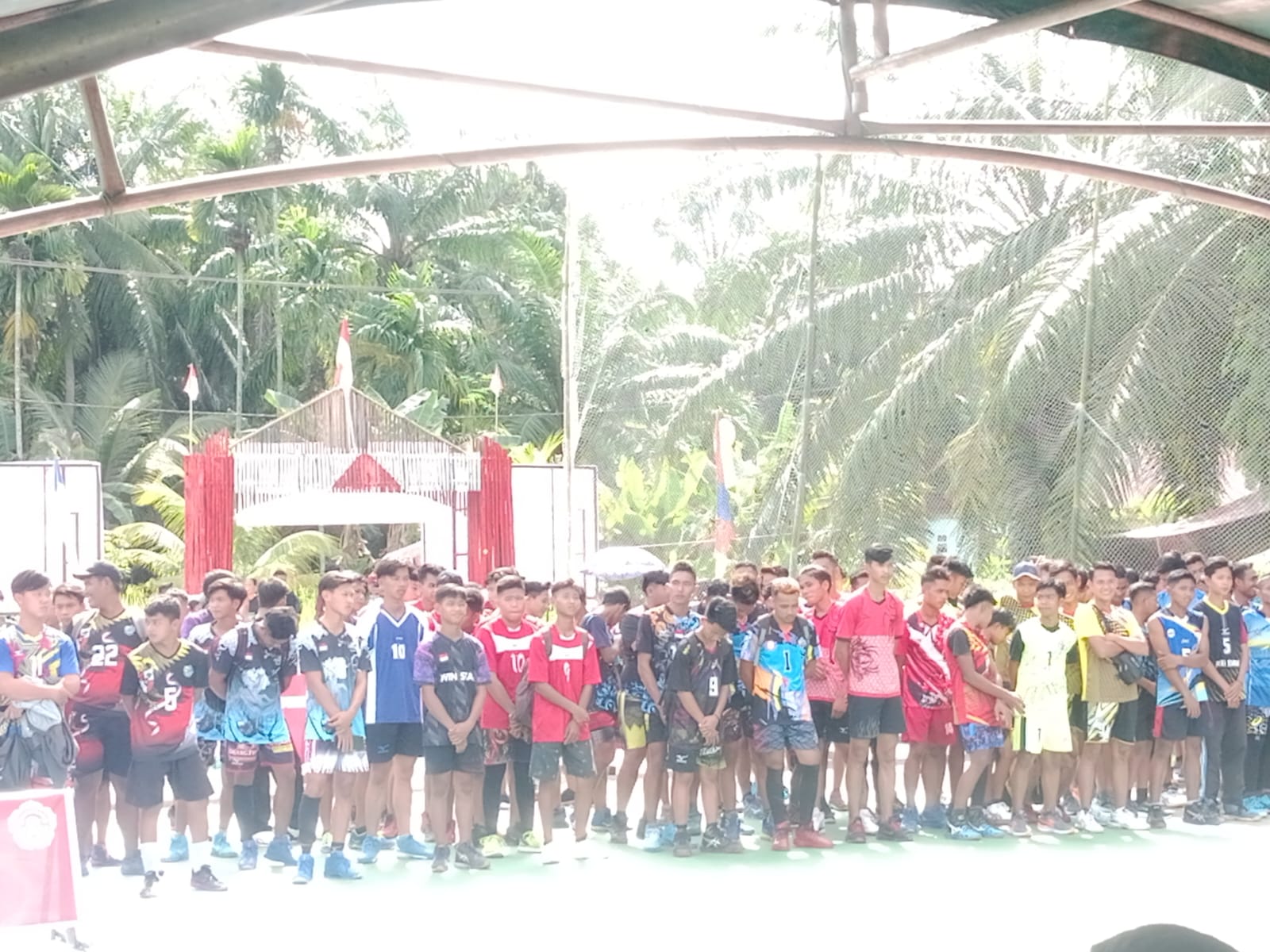 Menyanyikan lagu Indonesia raya yang diikuti tim peserta Turnamen,para undangan dan masyarakat memperlihatkan kemeriahan acara pembukaan turnamen Volly Ball Cup di Desa Huta Ayu.
