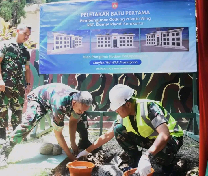 Pangdam IV/Diponegoro Mayjen TNI Widi Prasetijono melaksanakan peletakan batu pertama pada pembangunan Gedung Private Wing yang berada di Rumah Sakit Tk. III 04.06.04 Slamet Riyadi Denkesyah 04.04.04 Surakarta. Rabu (8/11/2023).