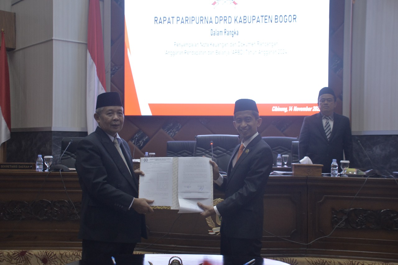 Pemerintah Kabupaten (Pemkab) Bogor bersama Dewan Perwakilan Rakyat Daerah (DPRD) Kabupaten Bogor melaksanakan Rapat Paripurna dalam rangka penyampaian Nota Keuangan dan Dokumen Rancangan Anggaran Pendapatan dan Belanja Daerah (APBD) Tahun Anggaran 2024. Rapat digelar di Ruang Rapat Paripurna DPRD, Cibinong, Selasa (14/11).