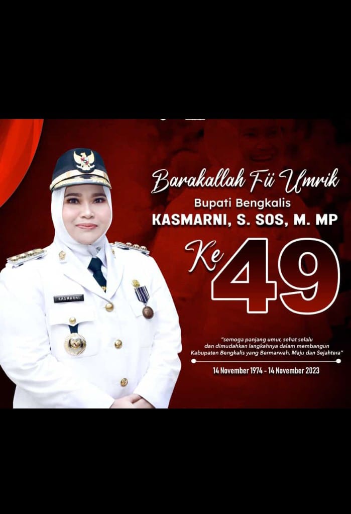 Ibu Kasmarni,S.Sos,MMP Bupati Kabupaten Bengkalis dalam kepemimpinannya telah banyak membuat terobosan dalam upaya meningkatkan Pelayanan Publik dan program-program yang menyentuh langsung untuk masyarakat, rasanya tak berlebihan banyak kalangan masyarakat yang mengucapkan Selamat Ulang Tahun pada hari ini kepada Ibuk Kasmarni,S.Sos,MMP sebagai wujud kecintaan masyarakat Kabupaten Bengkalis kepada Pemimpinnya.