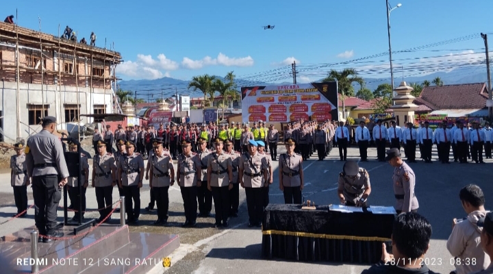 Kapolres Kerinci, AKBP Patria Rahardian diwakili oleh Waka Polres Kerinci Kompol Samsul Bahri Pinem memimpin upacara serah terima jabatan (sertijab) 11 anggota kepolisian di lingkup Polres Kerinci yang digelar di Halaman Mapolres Kerinci, Selasa (28/11/2023).