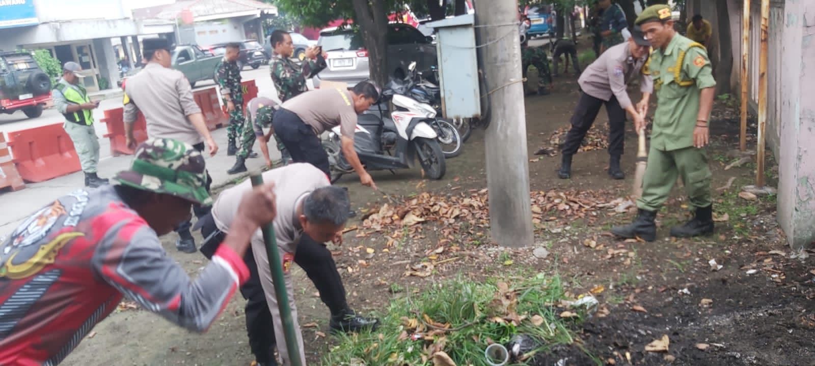 Sinergitas TNI-Polri dan Pemerintah setempat melaksanakan kegiatan kerja bakti membersihkan sampah dan saluran air ( Selokan ) di Terminal Klari Desa Anggadita, Kecamatan Klari, Karawang, Kamis (07/12/2023).