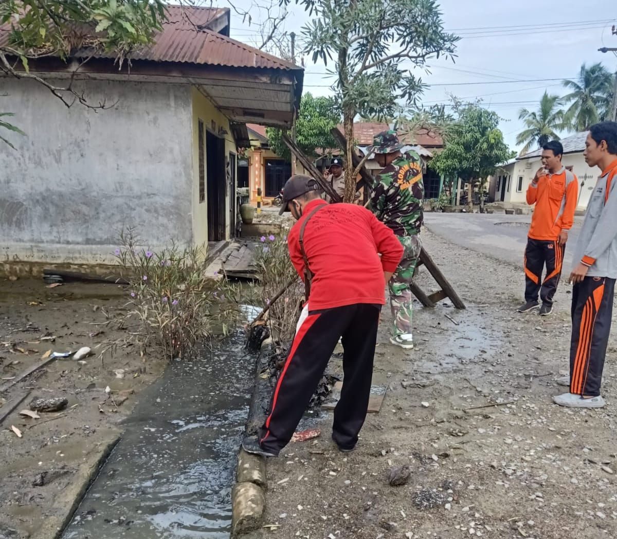 Dalam kegiatan ini, Serda Faris Panggabean mengajak warga bergotongroyong membersihkan sampah maupun endapan lumpur pada saluran drainase, sehingga tidak menyebabkan genangan banjir saat hujan.