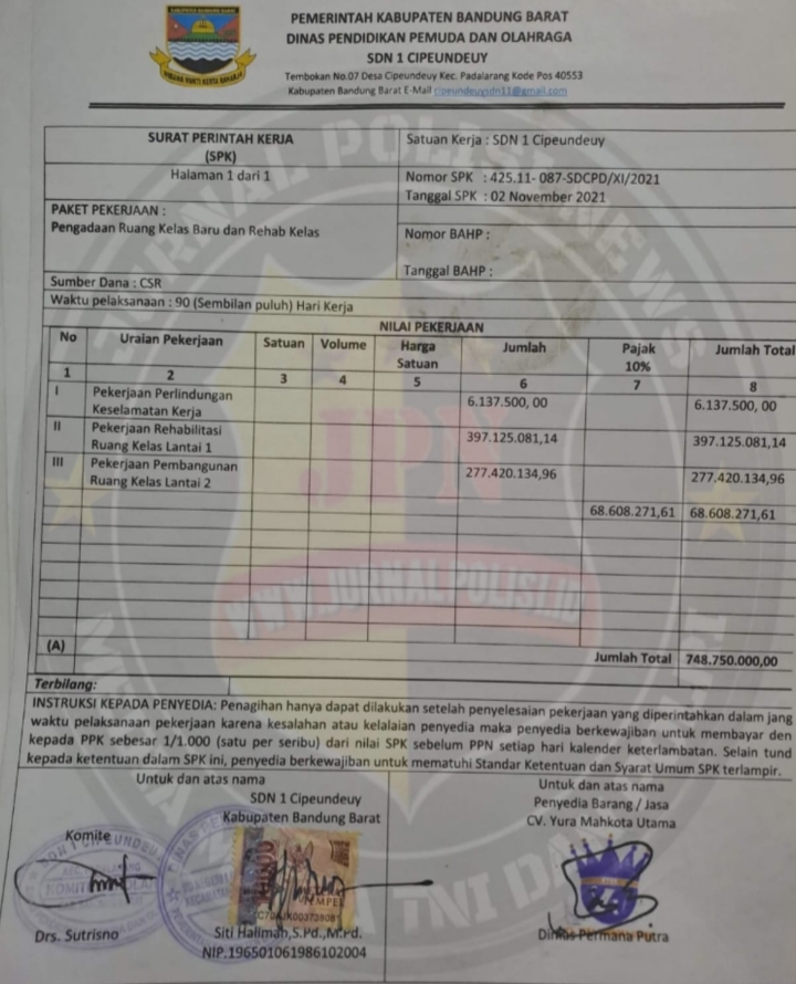 Menurut data dan informasi yang diterima oleh Tim Investigasi Jurnal Polisi News, dari perwakilan CV. RASATI WIRATAMA, Deki menjelaskan dasar awal kronologis pihaknya melakukan pekerjaan tersebut di SDN 1 Cipendeuy, Kecamatan Padalarang, Kabupaten Bandung Barat (KBB).