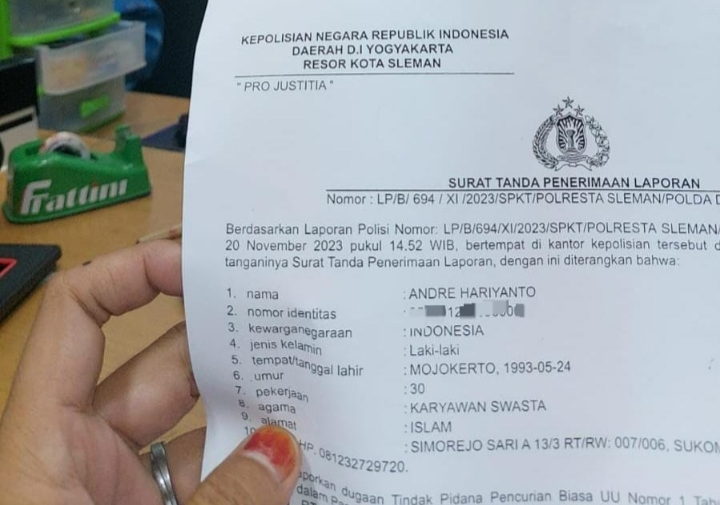 Diketahui, Laporan tersebut dari pihak kepolisian negara republik Indonesia daerah istimewa Yogyakarta resor kota Sleman dengan Nomor : LP/B/694/XI/2023/SPKT/Polresta Sleman/D.I Yogyakarta.