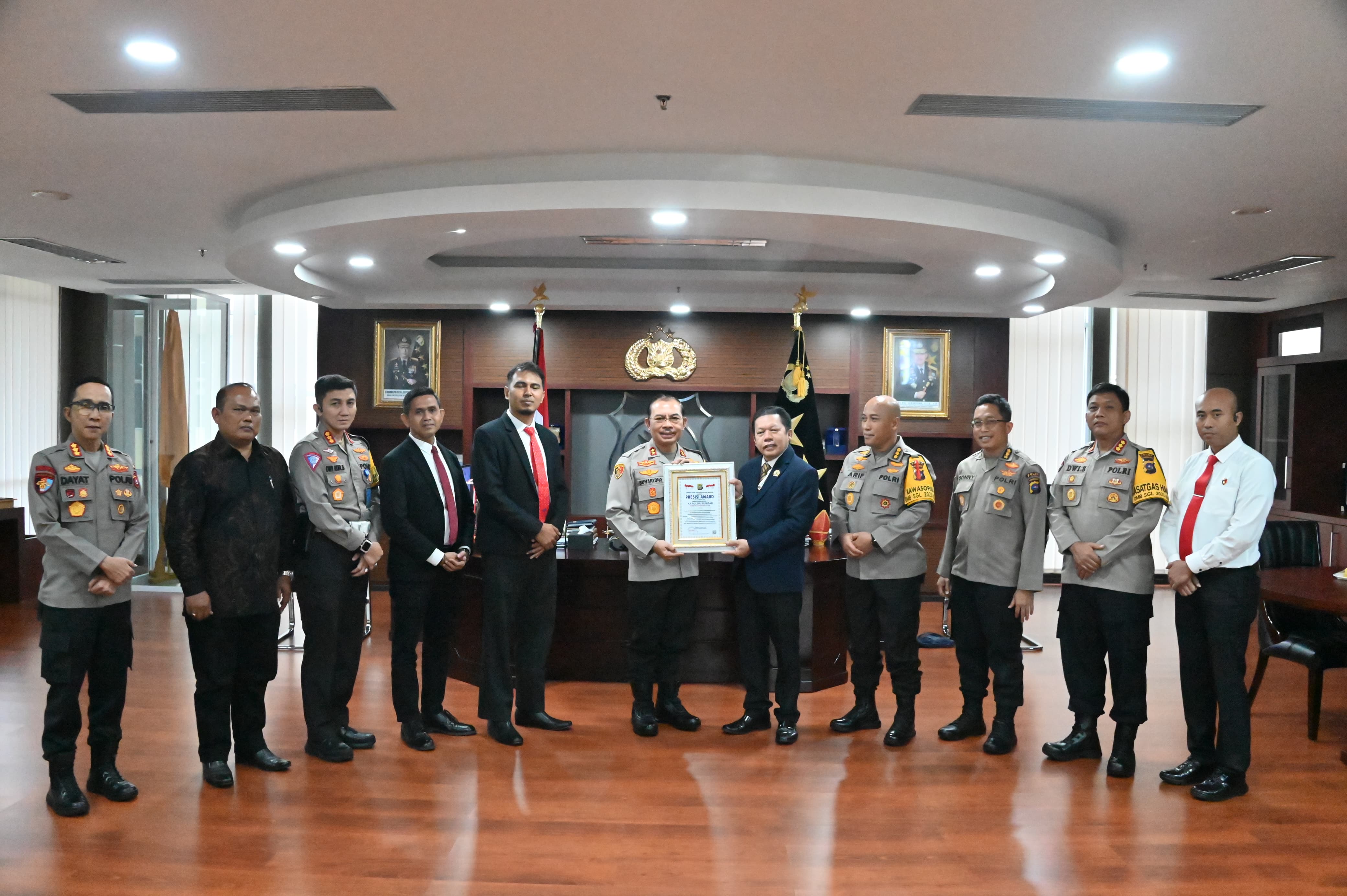 Direktur Eksekutif Lembaga Kajian Strategis Kepolisian Indonesia (LEMKAPI) Dr. Edi Hasibuan memberikan penghargaan kepada Kapolda Sumbar Irjen Pol Suharyono, S.Ik. SH pada Rabu tanggal 17 Januari 2024, di ruang kerja Kapolda Sumbar.