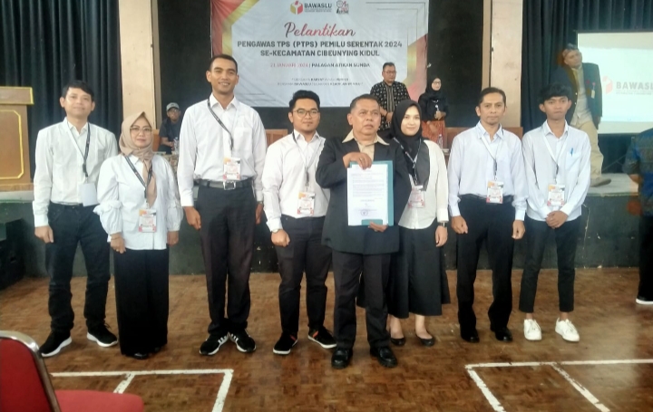 Panitia Pengawas Pemilihan Umum (Panwaslu) kecamatan Cibeunying Kidul laksanakan pelantikan Petugas Pengawas Tempat Pemungutan Suara (PTPS) tahun 2024 wilayah kecamatan Cibeunying Kidul di gedung sekolah SMA Yas Jalan PHH Mustofa (Suci), Minggu (21/1/2024).