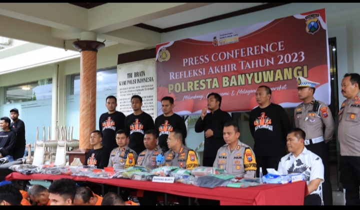 Dengan didampingi Wakapolresta Banyuwangi, AKBP Dewa Putu Eka Darmawan, beserta seluruh Pejabat Utama (PJU) Polresta Banyuwangi, semua tersangka dan barang bukti (BB) dipampang dalam Press Conference Refleksi Akhir Tahun 2023.