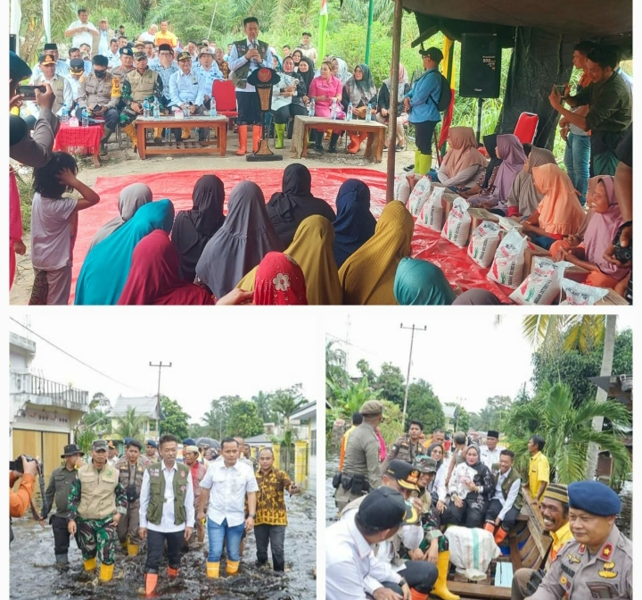 Bupati.Rokan Hilir-Afrizal Sintong SIP.MSi didampingi Ketua PKK Sanimar Afrizal dan Forkopimda meninjau banjir sekaligus mengantarkan bantuan jenis Sembako untuk warga Sekeladi dan Sekeladi Hilir, Kecamatan Tanah Putih, Rabu (10/1/2024) sore.