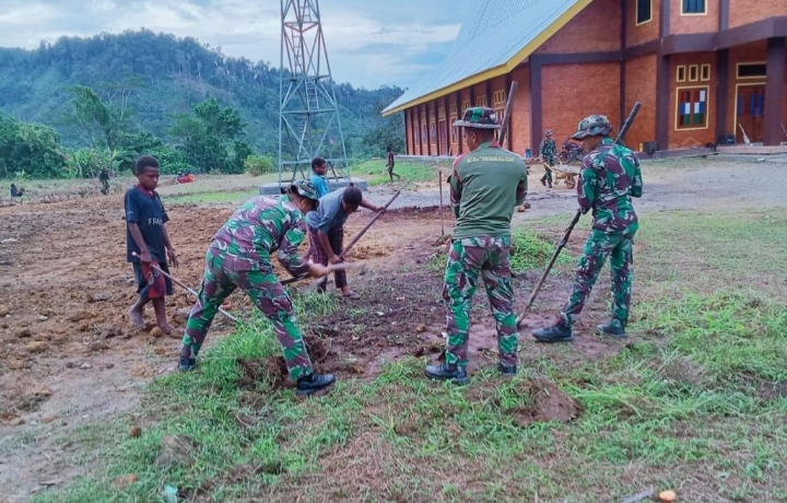 Satgas Yonif 200/BN melalui Pos Elelim melaksanakan gotong royong membersihkan halaman gereja bersama masyarakat bertempat di Gereja Katolik Keuskupan Jayapura, Distrik Elelim, Kab. Yalimo, Papua Pegunungan, Sabtu (06/01/2024).