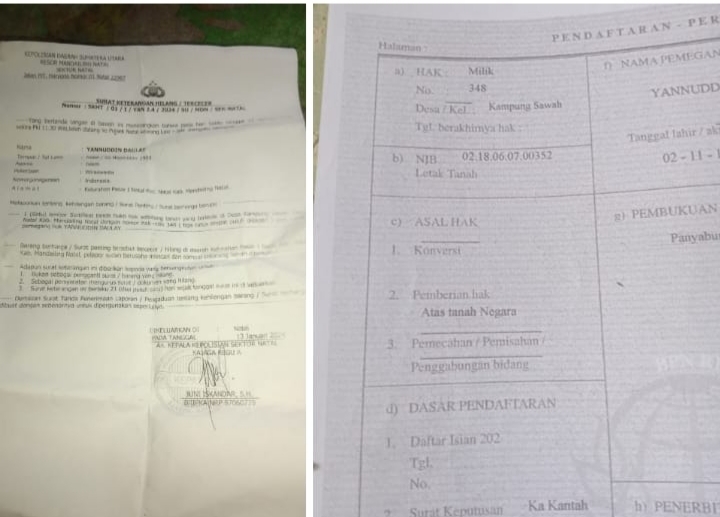 Surat- surat berharga tersebut di ketahui hilang/tercecer pada waktu mau menghadiri panggilan dari kepolisian Polres Madina seingat saya atasNama saya di duga di laporkan oleh Saipul Mahyar atas pemalsuan di polres Madina hingga tahun sekarang seingat saya 2022 – 2024 sampai sekarang masih dicari …adapun seingat saya di dalam perjalan dari rumah keluar kedaerah .mau ke mandailing Natal