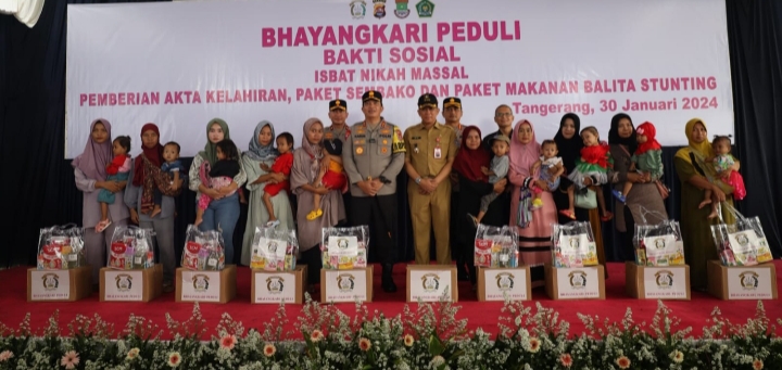 Polda Banten bersama Bhayangkari Polda Banten dan kementrian Agama Kabupaten Tangerang gelar bakti sosial kepada masyarakat Kecamatan Gunung Kaler, Kabupaten Tangerang pada Selasa (30/01).