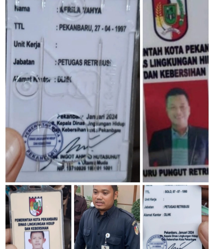 Dirinya di datangi oleh dua orang yang mengaku dari dinas kebersihan kota Pekanbaru masing-masing berinisial Hl dan AY meminta sejumlah uang kebersihan serta menunjukkan Bed Identitas kepada kami yang menyatakan petugas retribusi yang berwenang dlm pengambilan uang sampah .