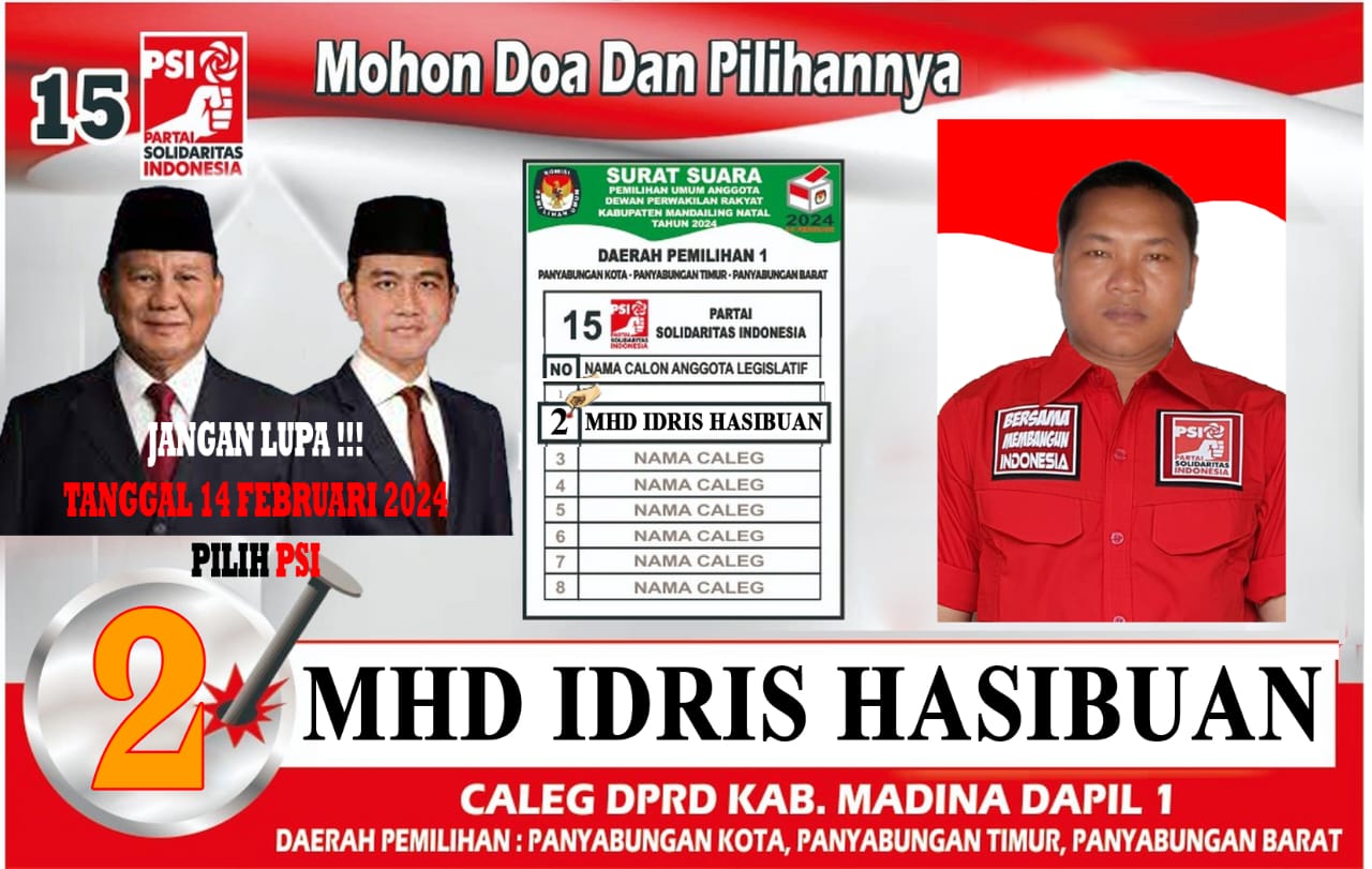 Pemilu,Jangan Lupa Tanggal 14 Pebruari 2024, Pilih Partai PSI .Calek DPRD KAB MADINA An MUHAMMAD IDRIS HASIBUAN DAPIL 1 Nomor Urut 2.Kabupaten Mandailing Natal