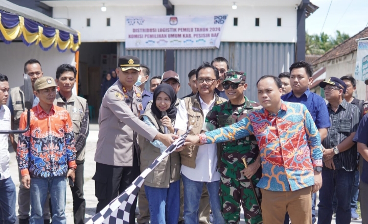 Bupati Pesisir Barat (Pesibar), Dr. Drs. Agus Istiqlal, S.H., M.H., menghadiri pelepasan logistik pemilu ke Kecamatan Bangkunat dari Gudang Logistik KPU Pesibar, di Pekon Kampung Jawa Kecamatan Pesisir Tengah, Sabtu (10/2/2024).