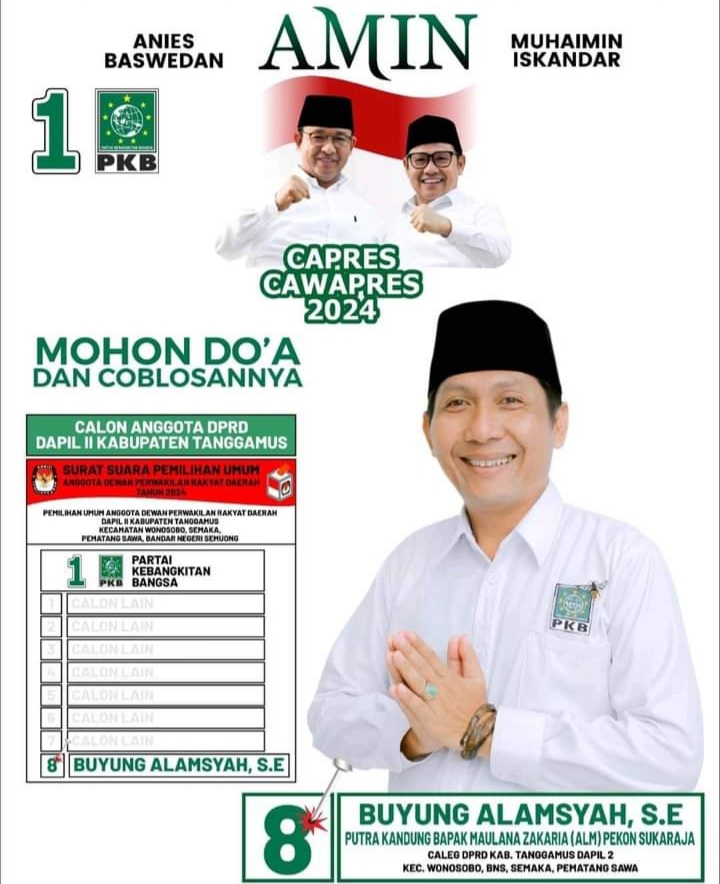 Buyung Alamsyah atau akrap disapa (Buyung Maulana) dipastikan melenggang mulus ke gedung DPRD Kabupaten Tanggamus dari daerah pemilihan dapil dua yang meliputi empat Kecamatan yakni Kecamatan Wonosobo, Bandar Negeri Semuong,Semaka,dan Kecamatan Pematang Sawa pada pemilu 2024 suara terbanyak kedua dari Partai Kebangkitan Bangsa (PKB)