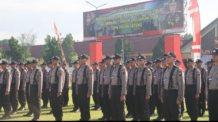 Polda Jateng Karo SDM Polda Jateng Kombes Pol Yohannes Ragil Heru Susetyo memimpin upacara Pembukaan Pendidikan Pembentukan Bintara Polri gelombang I tahun anggaran 2024 yang dilaksanakan di lapangan SPN Polda Jateng, Purwokerto, Banyumas, pada Selasa (13/2/2024).