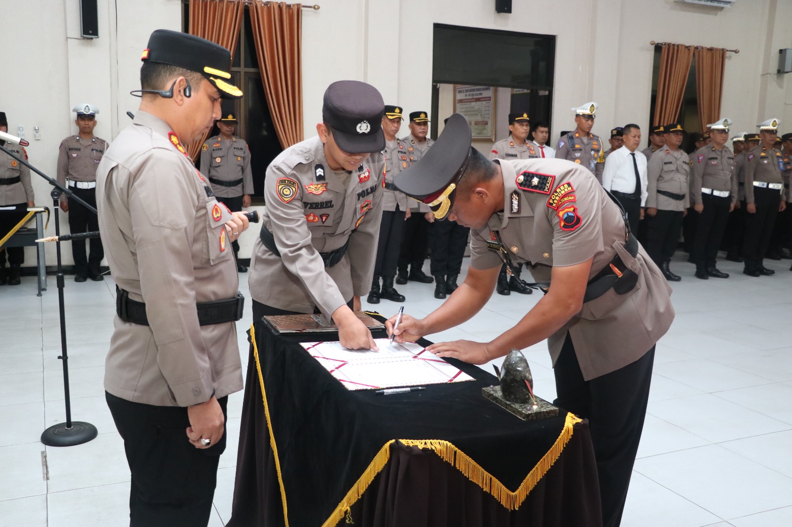 Upacara penerimaan jabatan dilaksanakan hari ini di ruang pertemuan Gedung Tribrata Mapolres Kebumen dihadiri PJU Polres, Kapolsek jajaran, serta Bhayangkari, Minggu 4 Februari 2024.