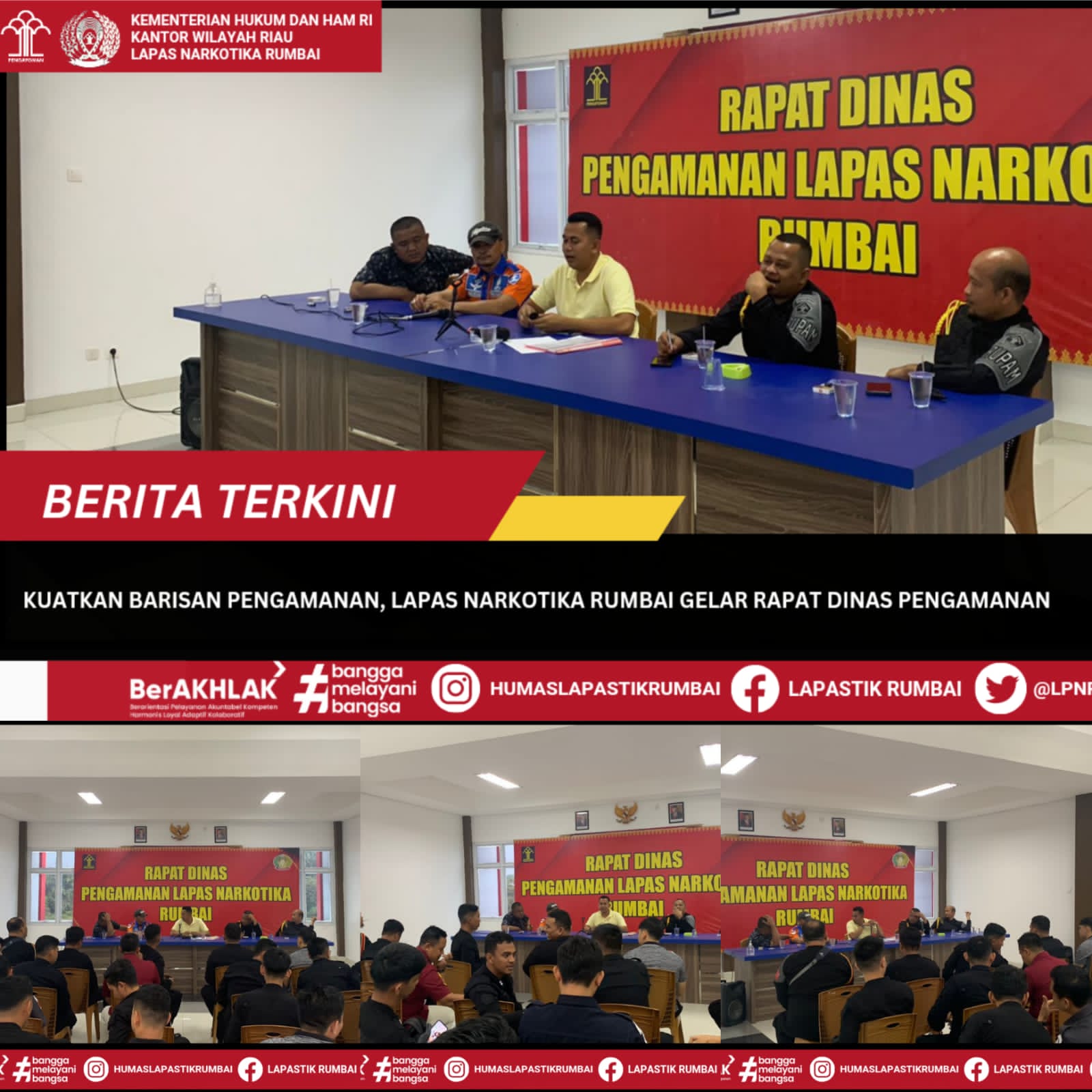 Kepala Lapas Narkotika Rumbai , Henri Alfa Edison Damanik yang dalam hal ini diwakili oleh Kepala Pengamanan Lapas, Nanda Adesaputra gelar rapat penguatan dengan seluruh jajaran Kesatuan Pengamanan Lembaga Pemasyarakatan (KPLP) Lapas Narkotika Rumbai pada Jum’at (19/01/2024) guna membentuk regu pengamanan (rupam) yang solid dan berintegritas tinggi dalam bertugas.
