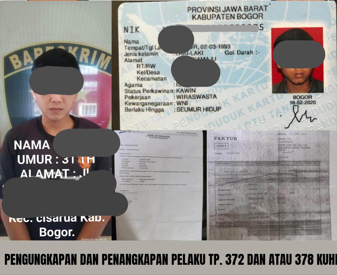 Proses penangkapan dilakukan oleh tim yang terdiri dari Ipda Buana Adi Putra, Aiptu Heri Supriatman dan Bripka Ricky Yanuar. Barang bukti yang berhasil diamankan antara lain surat keterangan leasing asli serta fotokopi BPKB yang dilegalisir. Kronologis pengungkapan dan penangkapan ini dimulai dari penyelidikan yang dilakukan oleh P.S. Panit II Reskrim Polsek Cisarua, Aiptu Heri Supriatman dan Bripka Ricky Yanuar, setelah mendapatkan informasi terkait keberadaan tersangka.