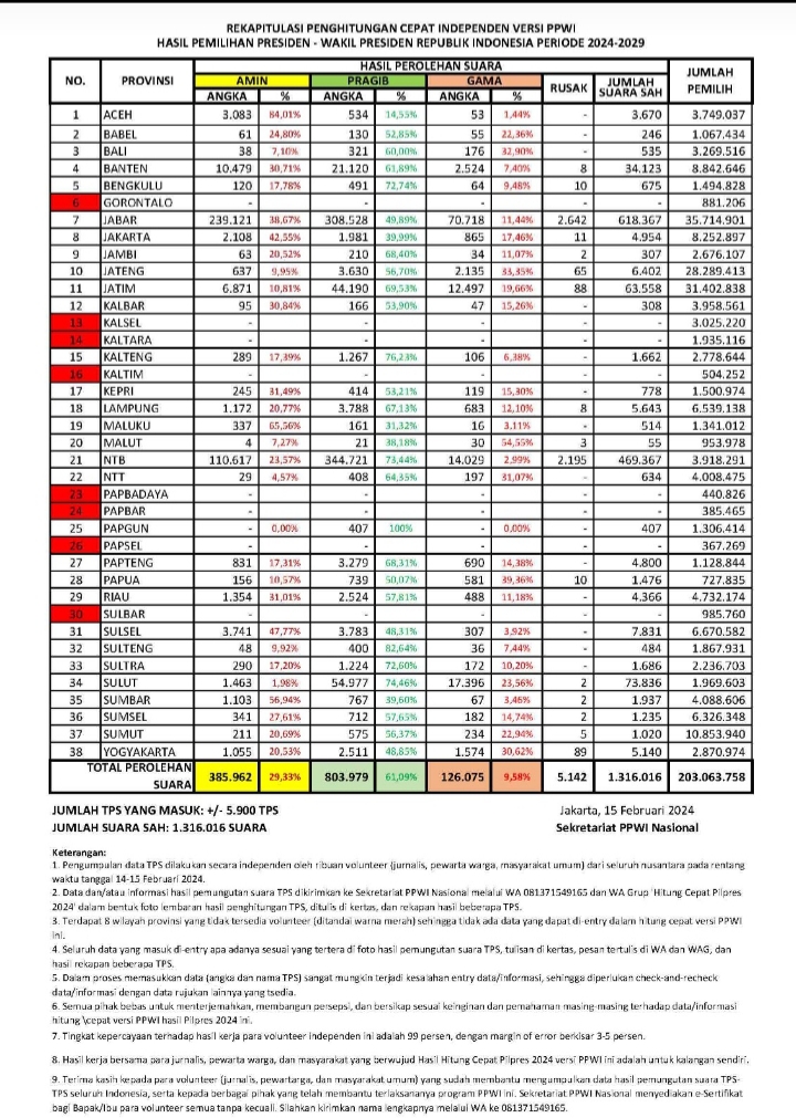 Lanjut dia, terdapat 8 wilayah provinsi yang tidak tersedia volunteer sehingga tidak ada data dari kedelapan wilayah tersebut yang dapat di-entry dalam hitung cepat versi PPWI ini. Provinsi yang tidak masuk dalam data hitung cepat ini adalah Provinsi Gorontalo, Kalimantan Utara, Kalimantan Timur, Kalimantan Selatan, Papua Barat Daya, Papua Selatan, Papua Barat, dan Sulawesi Selatan.