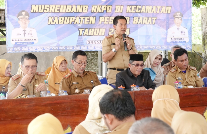 Pj. Sekda Kabupaten Pesisir Barat (Pesibar), Drs. Jon Edwar, M.Pd., menghadiri Musyawarah Perencanaan Pembangunan (Musrenbang) Rencana Kerja Pemerintah Daerah (RKPD) tingkat kecamatan Tahun 2024 untuk penyusunan RKPD Tahun 2025, di Aula Pemerintahan Kecamatan Bangkunat, Selasa (20/2/2024).